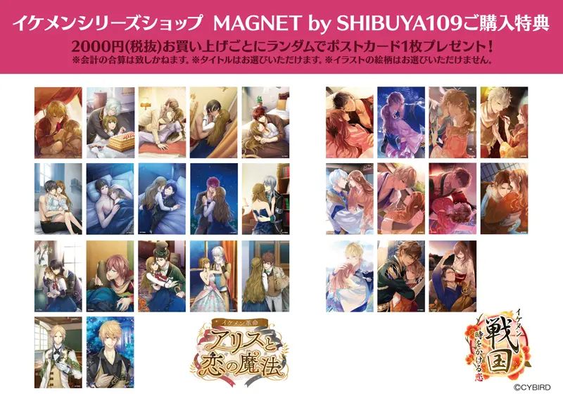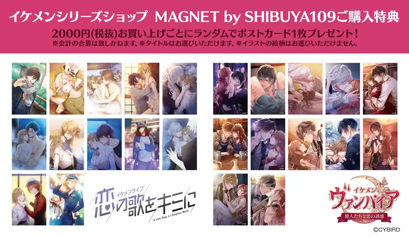 新作のアバターグッズほか、2000円(税抜)お買い上げごとに、「イケメン戦国」「イケメン革命」「イケメンヴァンパイア」「イケメンライブ」のスペシャルポストカードをランダムで1枚(タイトルはお選びいただけます)プレゼント!