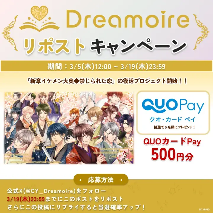 「Dreamoire(ドリモワ)」の公式Xアカウントにて抽選で5名様にQUOカードPay500円分をプレゼントするキャンペーンを開催します。
