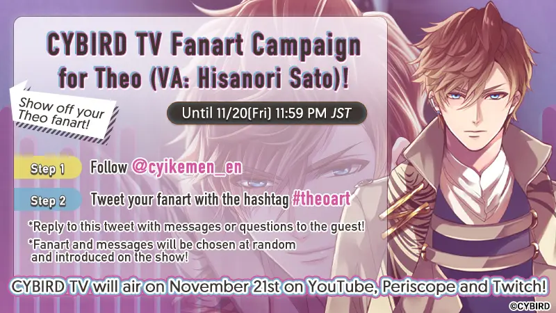 第1回放送ではゲストのキャラクター「テオドルス・ファン・ゴッホ」の職業である画商にちなみ、世界中のファンの皆様からファンアートを募集するキャンペーンを実施いたします。「イケメンシリーズ」海外公式Twitterアカウント(https://twitter.com/cyikemen_en)をフォローのうえ、指定のハッシュタグとともにファンアートをツイートしていただくと、ランダムで番組内で紹介します。また、キャンペーンツイートにリプライにて頂いたメッセージや質問もランダムでご紹介いたします。