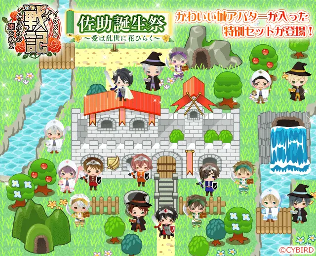 また、4月1日12:00から開催のシナリオイベント「佐助誕生祭~愛は乱世に花ひらく~」にて、「イケメン戦記~とらわれの姫を救え~」のミニキャラが城アバターとして、特別セット販売に登場しています。