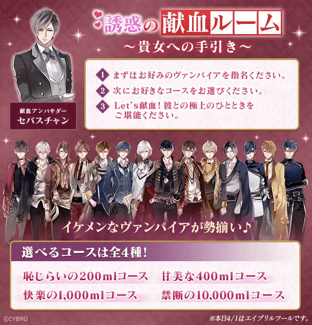 『誘惑の献血ルーム』では、14 人のイケメンなヴァンパイアたちからお好みの彼をひとり指名いただき、全4