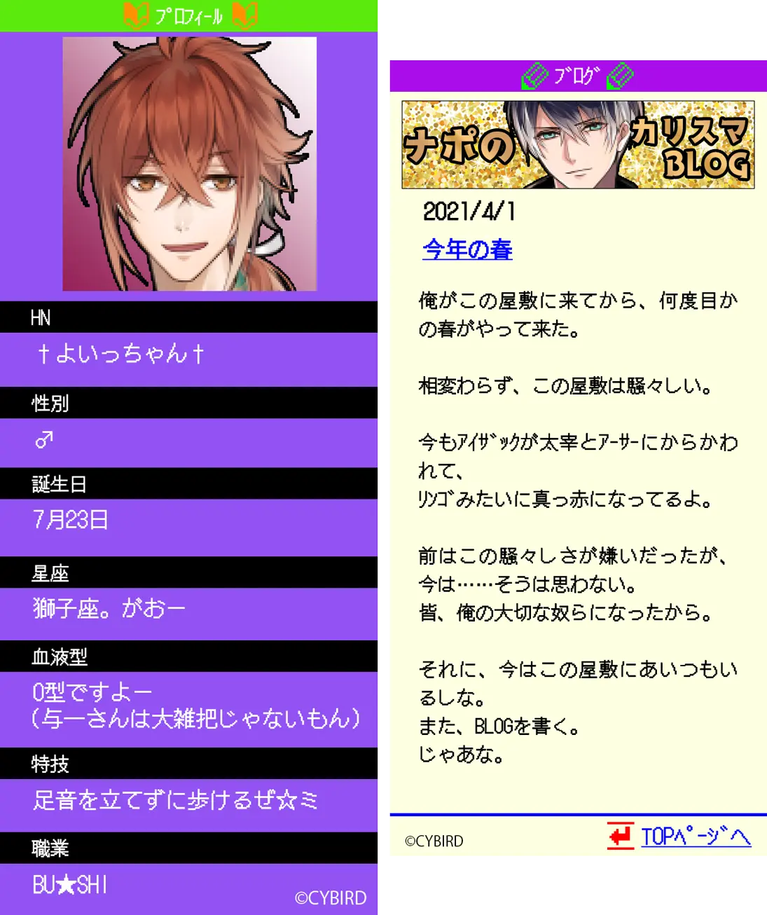 「イケメンシリーズ」に登場するカレたちが、予め用意された数多くの質問に答えて自己紹介をしていく「プロフィール」や、日々を綴った日記を公開する「ブログ」が公開されます。さらに、とある人物たちによる想像力に富む「夢小説」も、お楽しみいただけます。