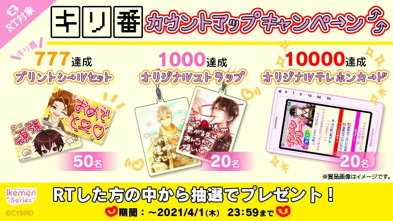 さらに、「イケメンシリーズ」公式Twitterではテレホンカード等の豪華賞品が抽選で当たる「キリ番カウントアップキャンペーン」も開催します。
