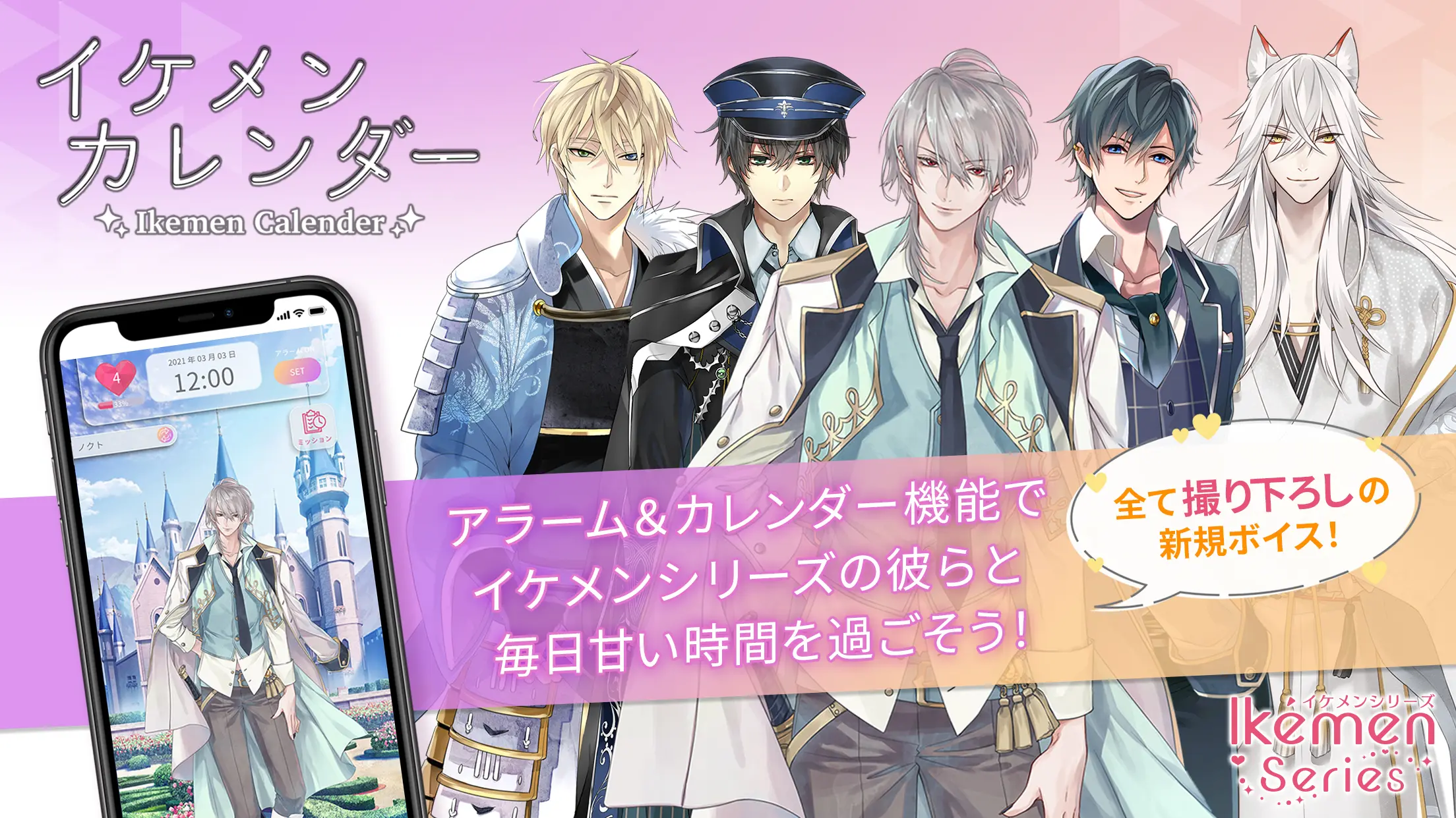「イケメンカレンダー」が4月12日(月)より配信開始となりました。「イケメンカレンダー」は、『イケメンシリーズ』のアラーム&カレンダーアプリとなっており、5人の『イケメンシリーズ』のキャラクターが登場します。お好きなキャラクターを選択すると、そのキャラクターがアラームで起こしてくれたり、カレンダーに登録した予定をお知らせしてくれます。