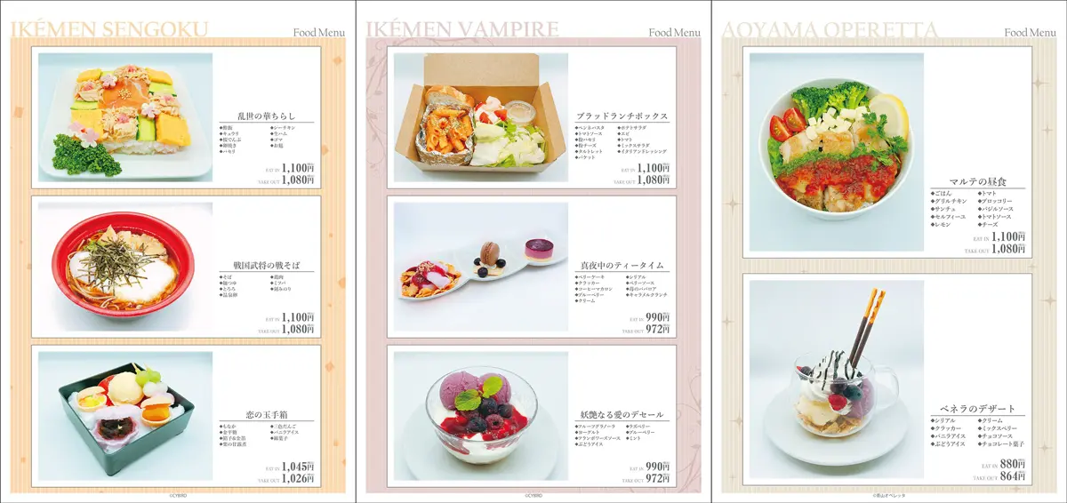 『イケメン戦国◆時をかける恋』、『イケメンヴァンパイア◆偉人たちと恋の誘惑』、『青山オペレッタ』をイメージした食事やデザートなどの全8種のオリジナルフードメニュー、全14種のオリジナルドリンクメニューを提供します。