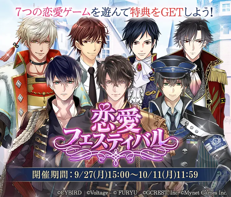「恋愛フェスティバル」は、サイバードの『イケメン革命◆アリスと恋の魔法』、『イケメンヴァンパイア◆偉人たちと恋の誘惑』、『イケメン王子 美女と野獣の最後の恋』の3タイトルが、株式会社マイネットゲームス(東京都港区、代表取締役社長:松本 啓志)が運営する「茜さすセカイでキミと詠う」(株式会社ジークレスト提供)、フリュー株式会社(本社:東京都渋谷区、代表取締役社長:三嶋 隆)が提供する「恋愛HOTEL~秘密のルームサービス」、株式会社ボルテージ(本社:東京都渋谷区 代表取締役:津谷 祐司)が提供する「鏡の中のプリンセス Love Palace」、「魔界王子と魅惑のナイトメア」の、全7アプリで同時開催するゲーム間コラボキャンペーンです。