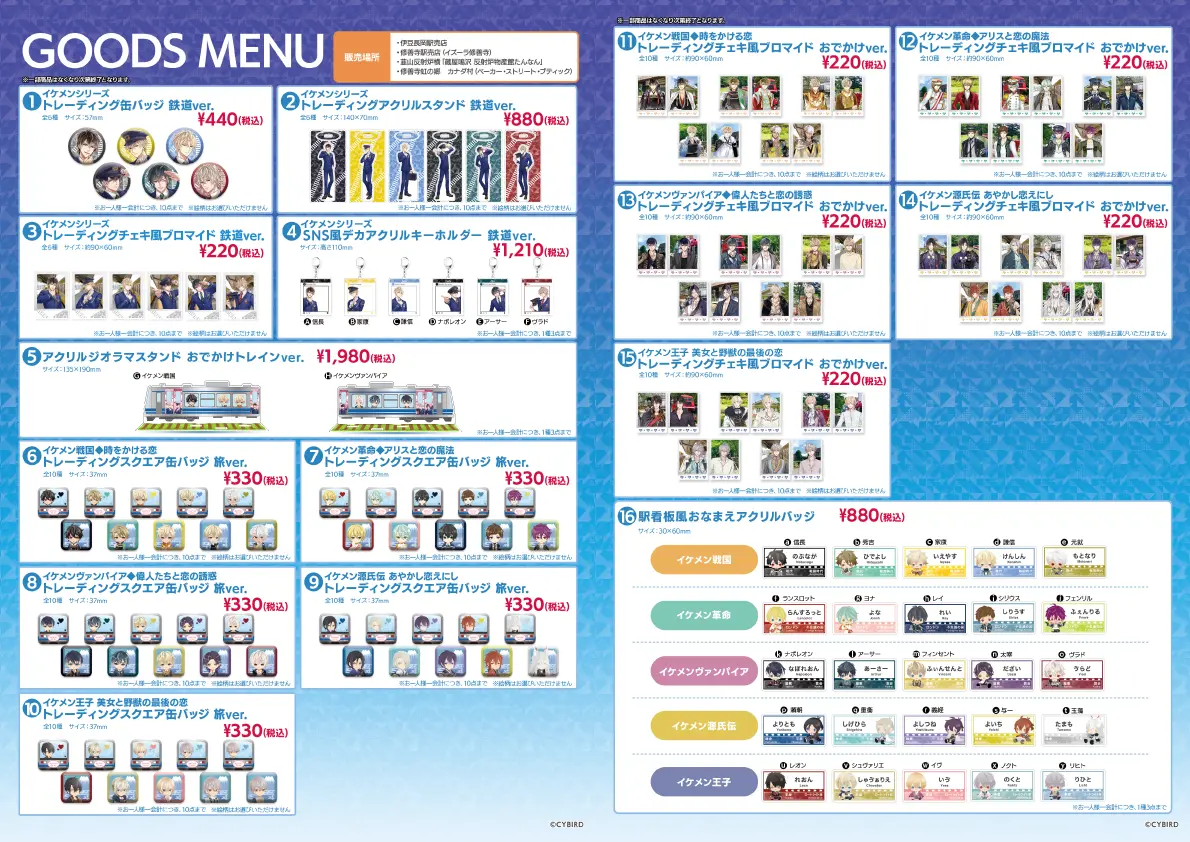 『イケメン戦国◆時をかける恋』と『イケメンヴァンパイア◆偉人たちと恋の誘惑』の描き下ろしコラボイラストを使用したオリジナルグッズや、『イケメン革命◆アリスと恋の魔法』『イケメン源氏伝 あやかし恋えにし』『イケメン王子 美女と野獣の最後の恋』のグッズを、「Yショップ伊豆長岡駅売店」「イズーラ修善寺(修善寺駅売店)」「韮山反射炉横/蔵屋鳴沢 反射炉物産館たんなん」「修善寺虹の郷/カナダ村(ベーカー・ストリート・ブティック)」にて販売します。