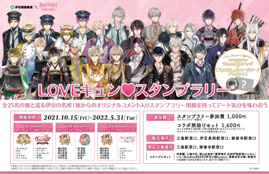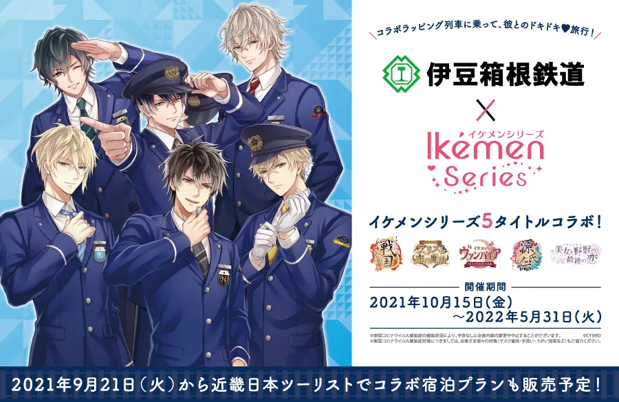2021年10月15日(金)から2022年5月31日(火)まで伊豆箱根鉄道駿豆線沿線上で「イケメンシリーズ」の人気5タイトル『イケメン戦国◆時をかける恋』『イケメン革命◆アリスと恋の魔法』『イケメンヴァンパイア◆偉人たちと恋の誘惑』『イケメン源氏伝 あやかし恋えにし』『イケメン王子 美女と野獣の最後の恋』のキャラクターを使用したコラボイベントが行われます。
