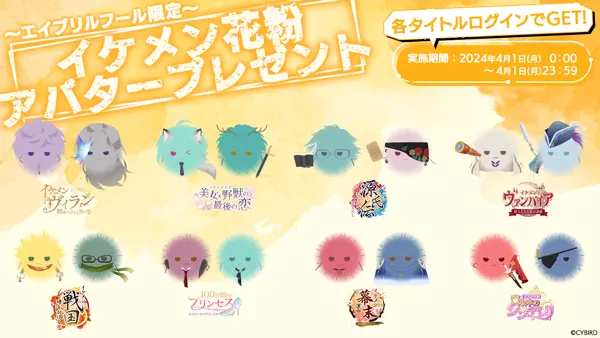 「イケメン花粉」発見を記念して、期間中に対象の「イケメンシリーズ」8タイトルにログインすると、「イケメン花粉」アバターがもらえます。