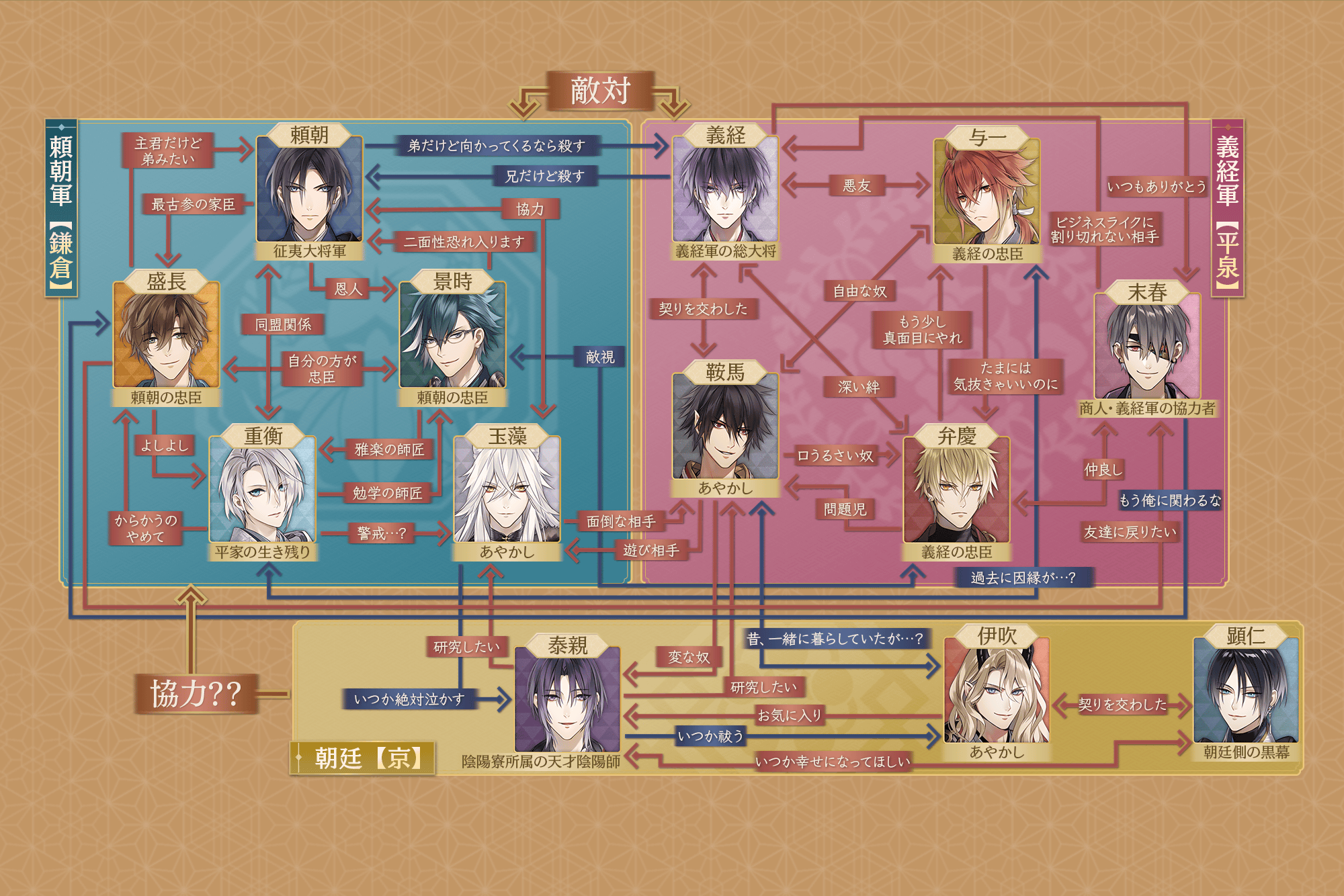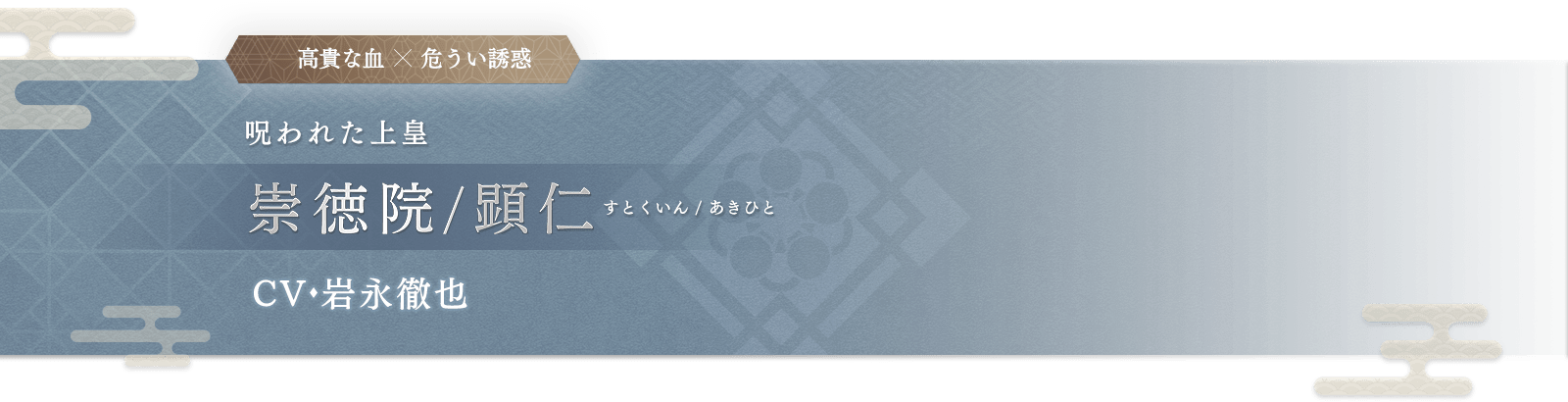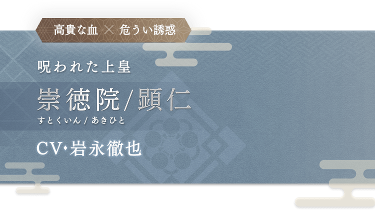とうに命を落としたはずの、かつての上皇。 優美に微笑していても、どこか底知れない色香を漂わせる。 伊吹と『契り』を交わし、朝廷に不穏な影を落とす存在。 生まれた時から呪いの力を持ち、日ノ本のすべてを恨んでいるという噂がある。 誕生日 7月7日 身長 176.0 cm 所属組織 朝廷 趣味 和歌、鼓を打つこと(伊吹が舞う時に打つ)