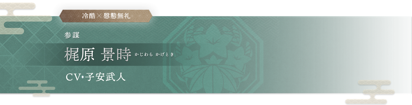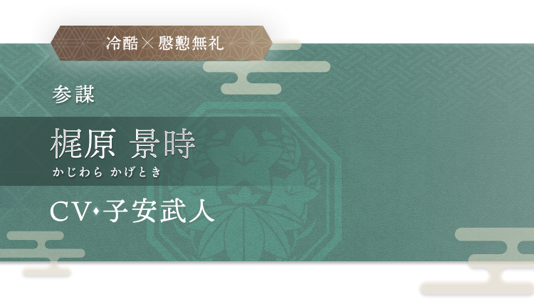 頼朝の側近で、容赦のない言動から他の武士達に恐れられている。 仕事においては有能だが、私生活では朝に弱く片付けができないなど意外な一面も持つ。 人に恨まれても幕府の影として振る舞うのには、何か理由があるようで……? 誕生日 6月2日 身長 179.5 cm 所属組織 鎌倉幕府 趣味 知識の収集、琴の練習(下手)