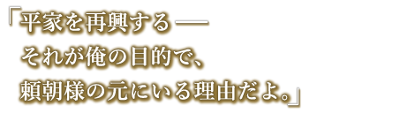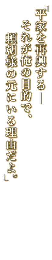 平家の生き残りで以前は頼朝とも敵対していたが、今は志を共にする仲間で同盟関係にある。 一見儚げで牡丹の花に形容されるほど容姿端麗だが、口は悪い。 努力を惜しまない性格で、雅楽のほか武術にも優れる。 誕生日 1月16日 身長 175.0 cm 所属組織 鎌倉幕府 趣味 楽器を奏でること(上手)