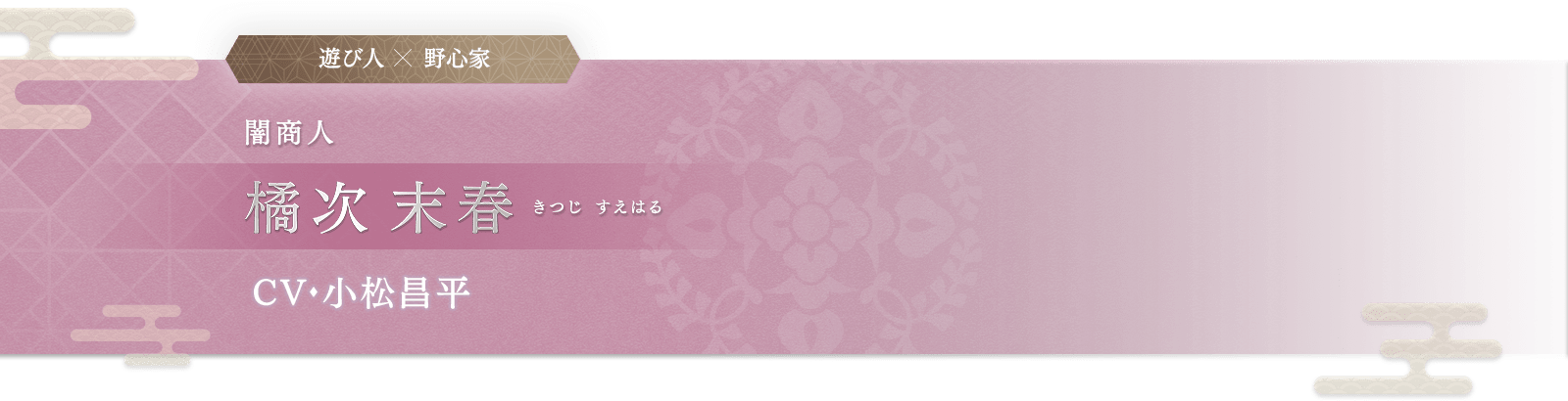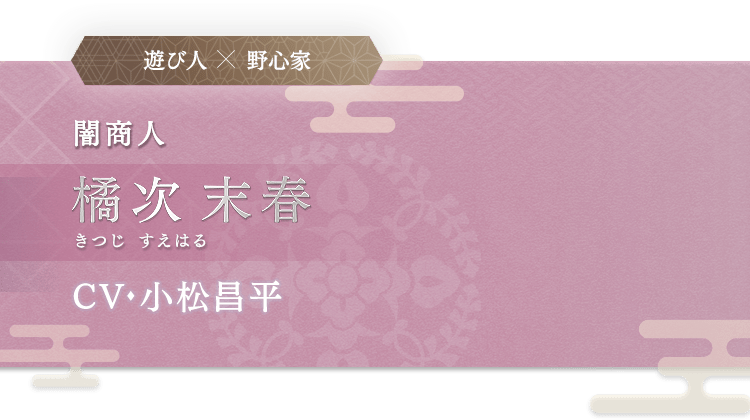 金売吉次とも呼ばれる、莫大な富を持つ商人。 女を口説くのが上手く一見愛想がいいけれど、その生き様はどこか刹那的。 同業者の間では商いのためなら手段を選ばない人間として恐れられている。 刀ではなく金を武器に戦い続ける彼の野心とは……? 誕生日 12月24日 身長 179.0 cm 所属組織 反乱軍(協力者) 趣味 女を口説くこと、金儲け