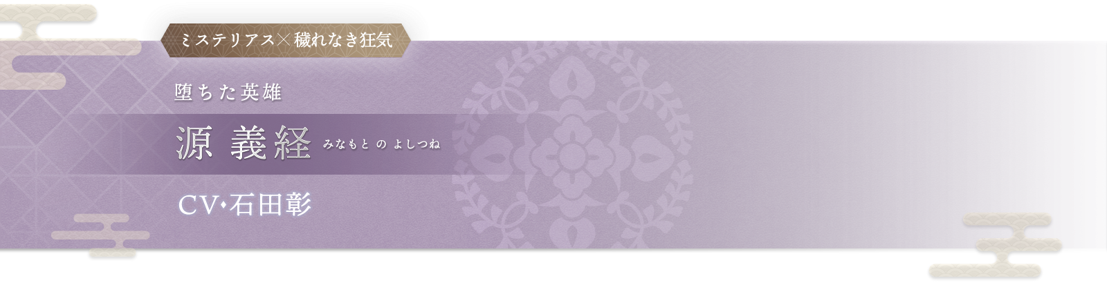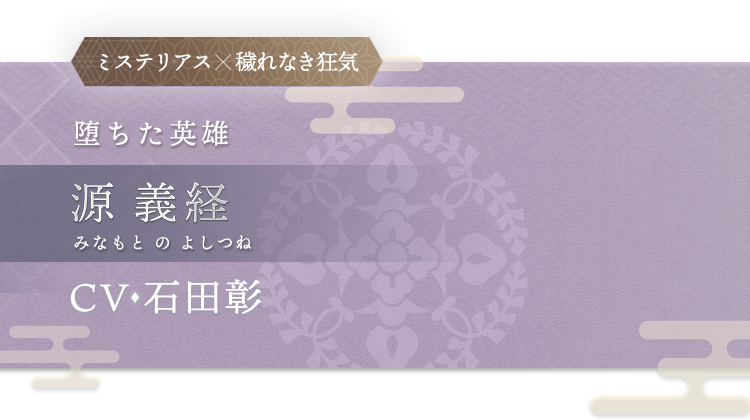 頼朝の異母弟であり、幕府に反乱する勢力の大将。 烏天狗と『契り』を交わし、人ならざる力を得た。 物憂げな雰囲気に似合わず戦いに天性の才を持つ。 狂気と紙一重の純粋なその心に、人は強烈に惹きつけられる。 誕生日 11月14日 身長 177.0 cm 所属組織 反乱軍 趣味 鍛錬、ひなたぼっこ