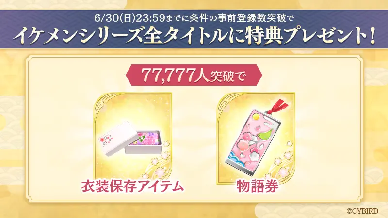 TOPページタイトル紹介イケメン源氏伝 あやかし恋えにしNewsお知らせイケメンシリーズユーザー限定事前登録キャンペーン実施中! 2019/06/14 イケメンシリーズユーザー限定事前登録キャンペーン実施中! ◆イケシリユーザー限定特典について◆ 2019年6月14日(金)~6月30日(日)の期間に、事前登録者数合計77,777人を達成すると、既にリリースされている「イケメンシリーズ」対象10タイトルをプレイしている方全員に、各タイトルにて使用できるアイテム「衣装保存アイテム1個&物語券1枚」をプレゼントします。 【プレゼント対象タイトル】 イケメン王宮◆真夜中のシンデレラ イケメン夜曲◆ロミオと秘密のジュリエット 新章イケメン大奥◆禁じられた恋 イケメン幕末◆運命の恋 100日間のプリンセス◆もうひとつのイケメン王宮 スイートルームの眠り姫 イケメン戦国◆時をかける恋 イケメン革命◆アリスと恋の魔法 イケメンヴァンパイア◆偉人たちと恋の誘惑 イケメンライブ 恋の歌をキミに 【付与日】 2019年7月3日(水)18時以降 【注意事項】 ※特典の受け取りは各ゲームでログインする必要があります ※特典の受け取り期限は2週間となります。 ※特典は各ゲームの受け取りページ等よりお受け取りください。 その他の事前登録特典はこちらをチェック