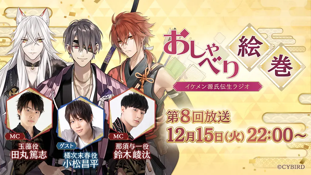 「禁秘の章~新たなる恋えにし~」の開幕を記念した、第8回「イケメン源氏伝生ラジオ おしゃべり絵巻」 が12月15日(火)に放送決定! MCに「玉藻」役の田丸 篤志さん、「那須与一」役の鈴木 崚汰さん、そして新キャラクター「橘次末春」役の小松 昌平さんをお迎えして、お送りします。