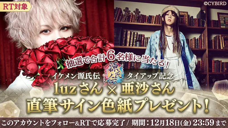 『イケメン源氏伝 あやかし恋えにし』公式Twitter(https://twitter.com/ikemen_genjiden)では、タイアップを記念して、luzさん、亜沙さんの直筆サイン色紙が合計で6名に当たるプレゼントキャンペーンを実施します。◆開催期間:12月4日(金)~ 12月18日(金)23:59 まで