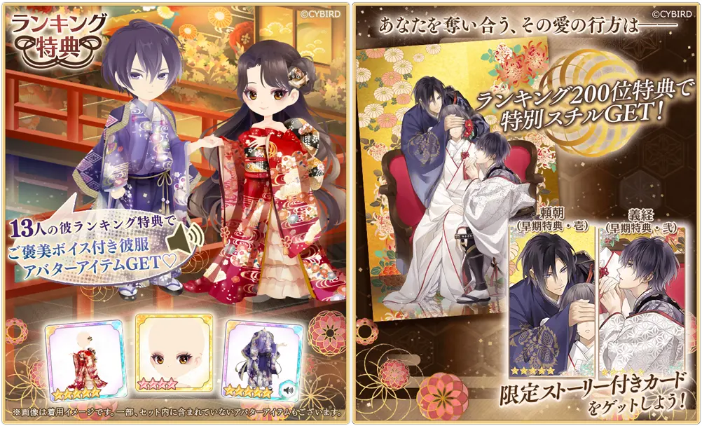 アプリをプレイするとコレクトアイテム(投票券)が獲得でき、彼らに投票することができます。投票した回数に応じて「源頼朝」と「源義経」があなたを奪い合うカードや、総選挙を記念した華やかなアバターアイテムを手に入れることができます。また、推しの彼に投票して「彼応援ランキング」の上位に入ると、初登場の「ご褒美ボイス付きアバターアイテム」など、レアな特典も獲得できます。