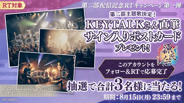 『イケメン源氏伝 あやかし恋えにし』公式Twitter(https://twitter.com/ikemen_genjiden)をフォローのうえ、対象ツイートをRTしていただいた方の中から抽選で3名様に「KEYTALKさん直筆サイン入りポストカード」をプレゼントします。開催期間:2022年8月1日(月)16:00~8月15日(月)23:59