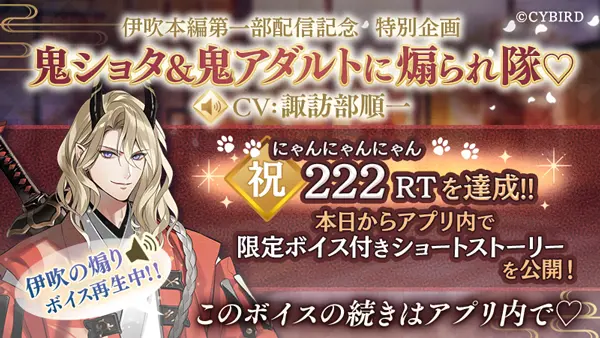 Twitter&アプリ内連動企画「鬼ショタ&鬼アダルトに煽られ隊♡」の対象ツイートが222RTを達成したため、アプリ内で「伊吹(CV:諏訪部 順一)」の限定ボイス付きショートストーリーを2023年1月31日(火)まで公開中です。