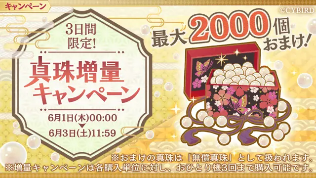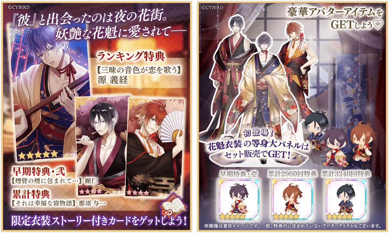 TOPページタイトル紹介イケメン源氏伝 あやかし恋えにしNewsお知らせ総選挙公約キャンペーン「男花魁~夜に乱れ咲く禁断の恋~」開催! ~3日限定!最大2000個のおまけがついてくる真珠増量キャンペーン実施~ 2023/06/01 総選挙公約キャンペーン「男花魁~夜に乱れ咲く禁断の恋~」開催! ~3日限定!最大2000個のおまけがついてくる真珠増量キャンペーン実施~ 『イケメン源氏伝 あやかし恋えにし』は、2022年に開催した「イケメン源氏伝総選挙」の公約で皆さまに選んでいただいた「男花魁」新衣装にて、本編応援キャンペーン「男花魁~夜に乱れ咲く禁断の恋~」を2023年6月1日(木)から6月14日(水)の期間開催します。 また、3日限定で、最大2000個のおまけがついてくる真珠増量キャンペーンも実施します。 ■総選挙公約本編応援キャンペーン「男花魁~夜に乱れ咲く禁断の恋~」開催 2022年開催の「イケメン源氏伝総選挙」の公約で皆さまに選んでいただいた「男花魁」新衣装で彼らが登場! 総選挙で1位~3位に輝いた、【義経・顕仁・与一】の3人との切なくも甘い艶やかなストーリーがお楽しみいただけます。 決意を固め、足を踏み入れたのは絢爛豪華な夜の花街。 虚実入り乱れるこの遊郭で、手に入れるのはひと夜の夢? それとも―― ランキング・早期・累計特典:特別に描き下ろした、男花魁の義経・顕仁・与一の妖艶なカードが登場します。 早期・累計特典/セット販売:花魁衣装の特別な彼ぬいはここだけでしか手に入らない特典となっております。 さらにセット販売にて等身大パネルが初登場!ぜひお部屋に飾ってください。 総選挙公約本編応援キャンペーン開催期間: 2023年6月1日(木)16:00~6月14日(水)23:59 ※各特典の獲得期間などの詳細はアプリ内のお知らせをご確認ください。 ■3日限定!真珠増量キャンペーン開催 2023年6月1日(木)から6月3日(土)の3日限定で、最大2000個のおまけがついてくる真珠増量キャンペーンを実施します。 とってもお得に獲得できる期間をお見逃しなく! 開催期間: 2023年6月1日(木)0:00~6月3日(土)11:59