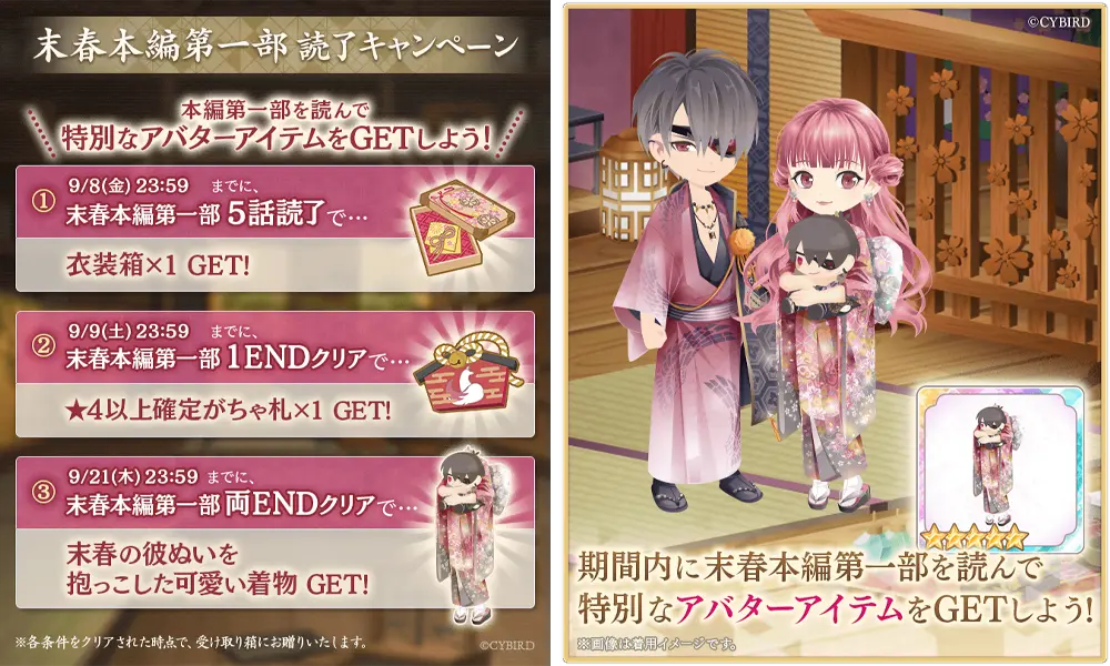 「橘次末春(CV:小松 昌平)」本編第一部を期間内に読むと、豪華な限定アイテムを手に入れることができます。