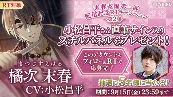 配信を記念して「橘次末春」の声優を務めている、小松 昌平さんの直筆サイン入りスチルパネルのプレゼントキャンペーンを実施します。