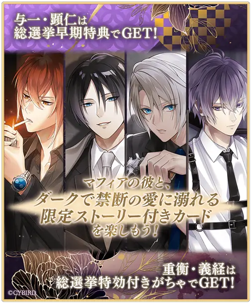さらに総選挙内では「那須与一(CV:鈴木 崚汰)」と「崇徳院/顕仁(CV:岩永 徹也)」、総選挙の特効付きがちゃでは「源義経(CV:石田 彰)」と「平重衡(CV:市川 蒼)」のマフィアの彼とダークで禁断の愛に溺れる限定ストーリーが楽しめるカードが登場。
