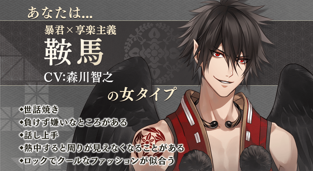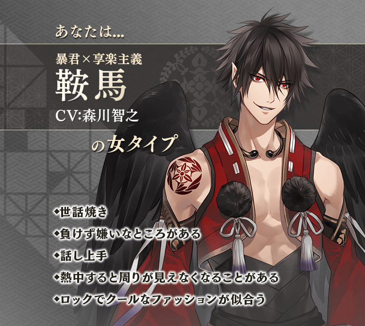 TOPページタイトル紹介イケメン源氏伝 あやかし恋えにしいとをかし恋人タイプ診断鞍馬(CV:森川 智之) かなりの上から目線で王様気質の鞍馬とは最初は反発しあってしまいそうですが、世話焼きで明るいあなたの性格がいい方向に働くことでしょう。誰にでもしっかりと意見を言うあなたの姿に鞍馬は自然と惹かれていきます。誇り高い彼の生き方をあなたは尊重しそんなあなたを彼も認め、もしも困難が降り掛かった時にはすべて蹴散らしてくれるはずです。