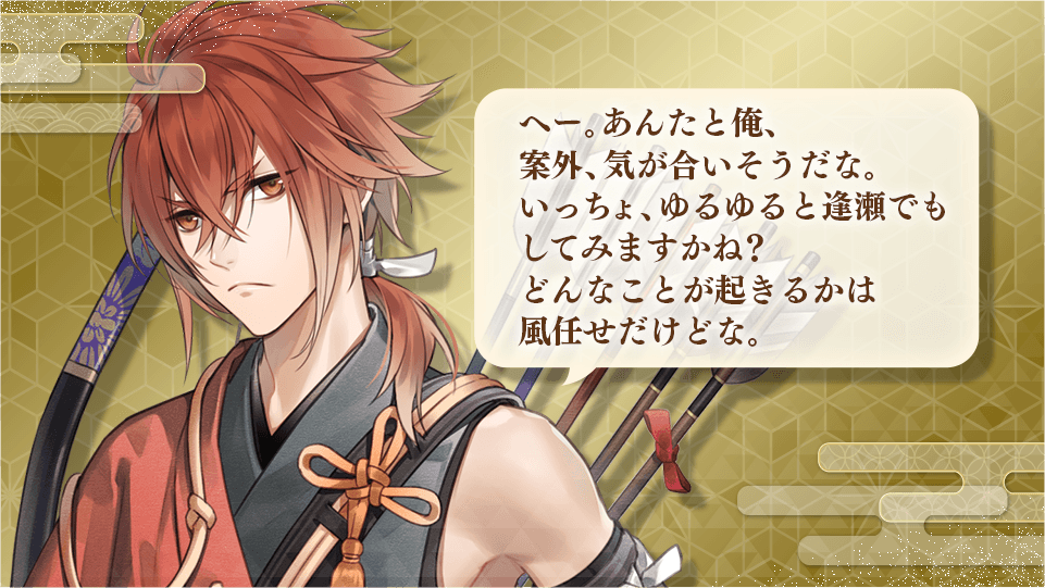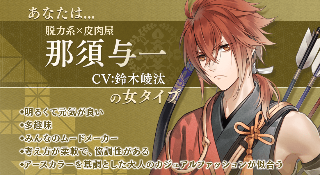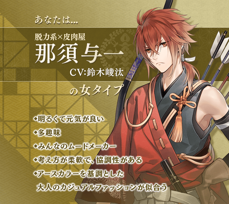 TOPページタイトル紹介イケメン源氏伝 あやかし恋えにしいとをかし恋人タイプ診断那須 与一(CV:鈴木 崚汰) マイペースな与一と、あなたの柔軟で協調性があるところがピッタリ合い、一緒にいると心地よく感じるはず。距離を詰めてくるのが上手く意外と大人な与一の魅力にあなたはハマっていきそう。気づいたらお互いがかけがえのない存在となり、二人でゆるゆると人生を楽しんでいけることでしょう。