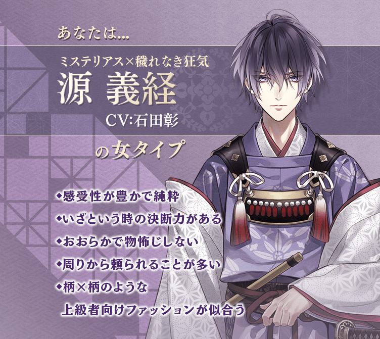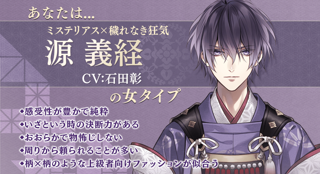 TOPページタイトル紹介イケメン源氏伝 あやかし恋えにしいとをかし恋人タイプ診断源 義経(CV:石田 彰) 感情が表に出ない義経は、コロコロと表情が変わるあなたを不思議に思い興味を持ちそう。おおらかで物怖じせず自分の意見を伝えるあなたに、一見近寄りがたい雰囲気の彼もほだされていくことでしょう。狂気と純粋さを併せ持つ義経とは、結ばれるまで波乱万丈な恋路となりますが、息もつけないくらい愛してくれる彼から離れられなくなってしまうはず。