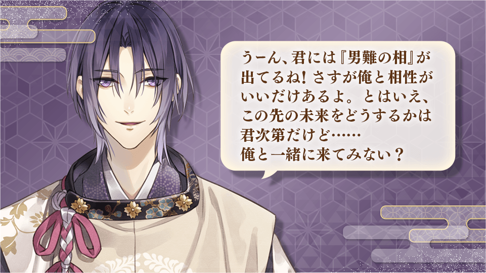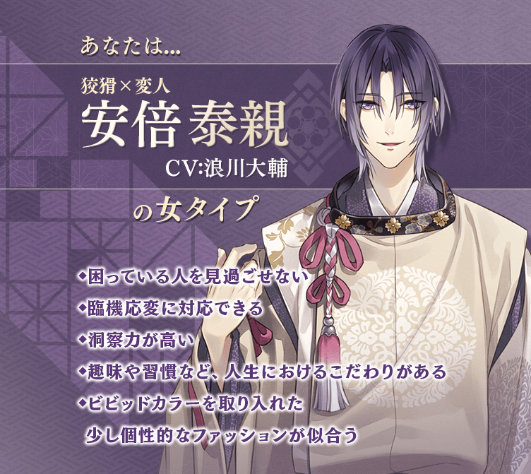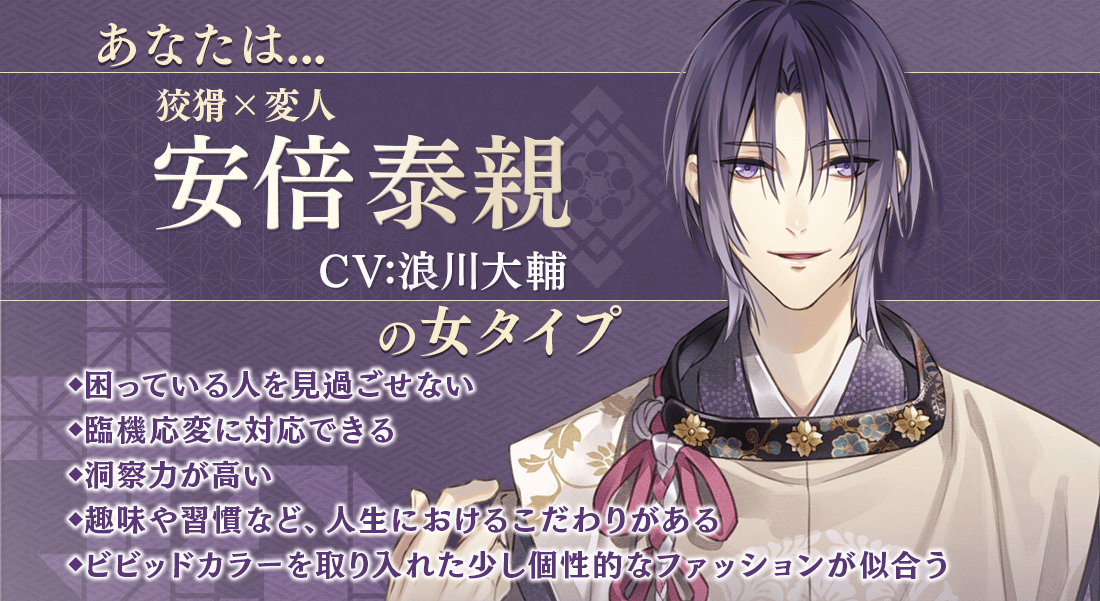 TOPページタイトル紹介イケメン源氏伝 あやかし恋えにしいとをかし恋人タイプ診断安倍 泰親(CV:浪川 大輔) 個性的で本心が掴みにくい泰親に最初のうちは振り回されてしまいそうですが、真摯に向かい合ううちに思わぬ素顔が見えてきそう。優しく洞察力の高いあなたなら、彼の自分でも気づいていない本音を引き出すことができるでしょう。自分だけの深い人生観を大切にしているあなたに泰親も興味をひかれ、一生に一度しか巡り会えない特別なパートナーとなります。