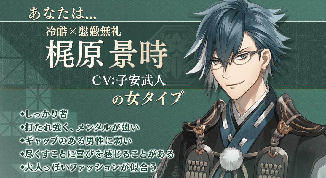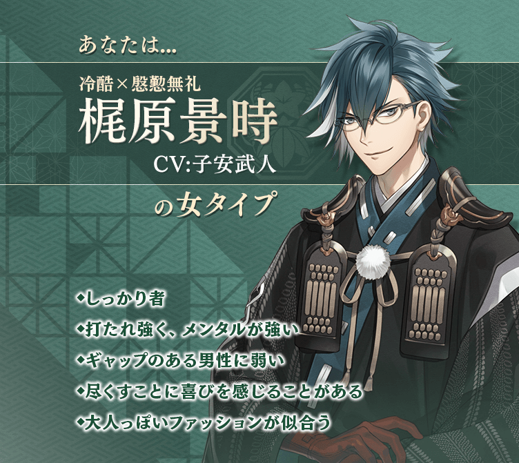 TOPページタイトル紹介イケメン源氏伝 あやかし恋えにしいとをかし恋人タイプ診断梶原 景時(CV:子安 武人) 冷酷に人の能力や成果を判断し、容赦のない言動をする景時も、逆境にめげないあなたの強さには思わず心惹かれそう。仕事においては有能で頭脳明晰な彼ですが、私生活では片付けが苦手だったり朝に弱かったりする不器用さがあり、そんなギャップにあなたもいつの間にかハマってしまうことでしょう。互いが互いを尊敬しサポートしあえる素晴らしい関係になれます。