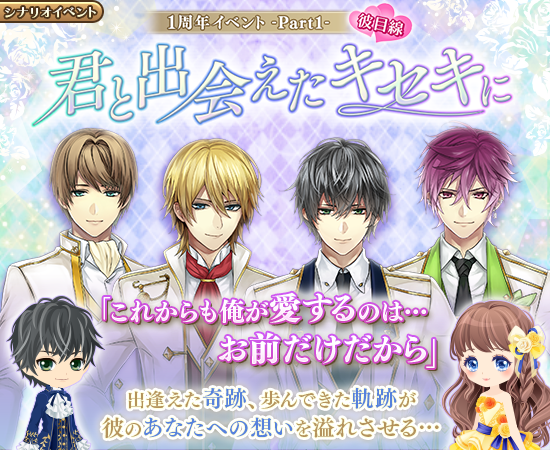 1周年記念キャンペーン 1周年シナリオイベントPart1を開催! 1周年シナリオイベントのPart1を開催! あなたとの出逢いを全編彼目線で振り返ります。さらに登場キャラクター全員、特別な「式服」の衣装で登場します♪ ▼Part1の登場キャラクターはコチラ▼ ランスロット、エドガー、レイ、フェンリル 友だちに教える! 1周年ページTOPへ