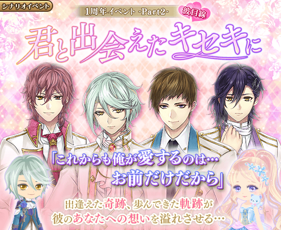 1周年記念キャンペーン 1周年シナリオイベントPart2を開催! 1周年シナリオイベントのPart2を開催! あなたとの出逢いを全編彼目線で振り返ります。さらに登場キャラクター全員、特別な「式服」の衣装で登場します♪ ▼Part2の登場キャラクターはコチラ▼ ヨナ、シリウス、ルカ、ロキ 友だちに教える! 1周年ページTOPへ