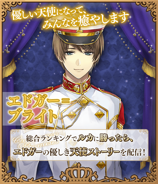 エドガー 最終結果 ◆総合ランキング:5位 票数:636,156票 ◆ジェントル部門:2位 票数:529,731票 応援ツイート 下記のボタンから、彼に「お疲れ様」メッセージをツイートしよう! ツイートする 総選挙TOPへ 出場キャラクター 最終得票数や公約内容をチェックしよう! ランスロット ヨナ エドガー ゼロ カイル レイ シリウス ルカ フェンリル セス ハール ロキ ブラン オリヴァー