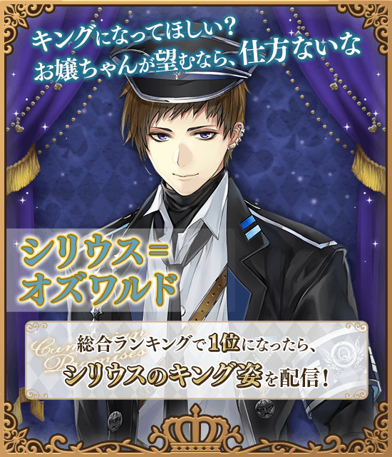 シリウス 最終結果 ◆総合ランキング:2位 票数:1,114,619票 ◆セクシー部門:2位 票数:420,574票 ◆ジェントル部門:1位 票数:682,165票 応援ツイート 下記のボタンから、彼に「お疲れ様」メッセージをツイートしよう! ツイートする 総選挙TOPへ 出場キャラクター 最終得票数や公約内容をチェックしよう! ランスロット ヨナ エドガー ゼロ カイル レイ シリウス ルカ フェンリル セス ハール ロキ ブラン オリヴァー