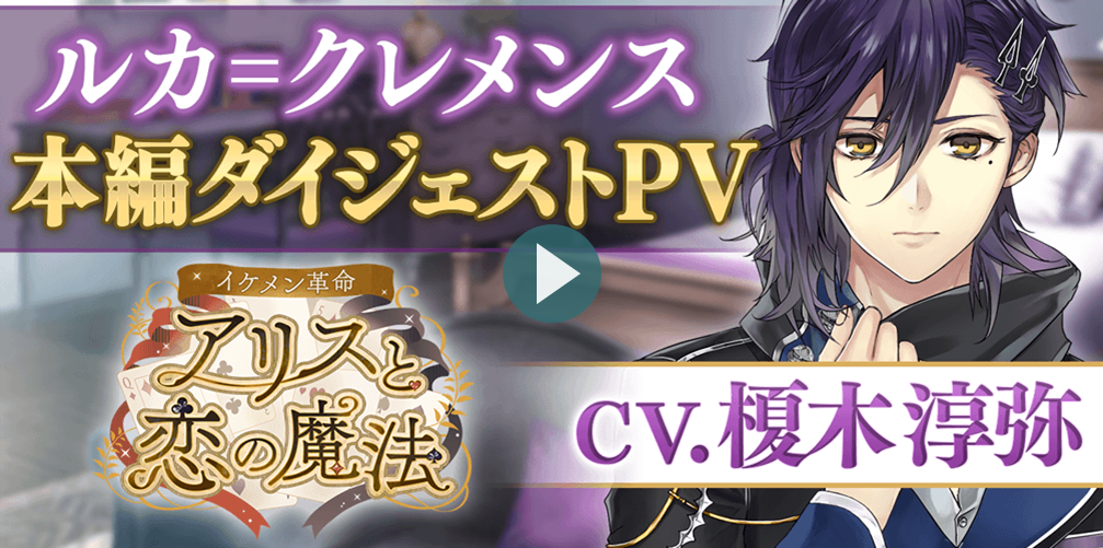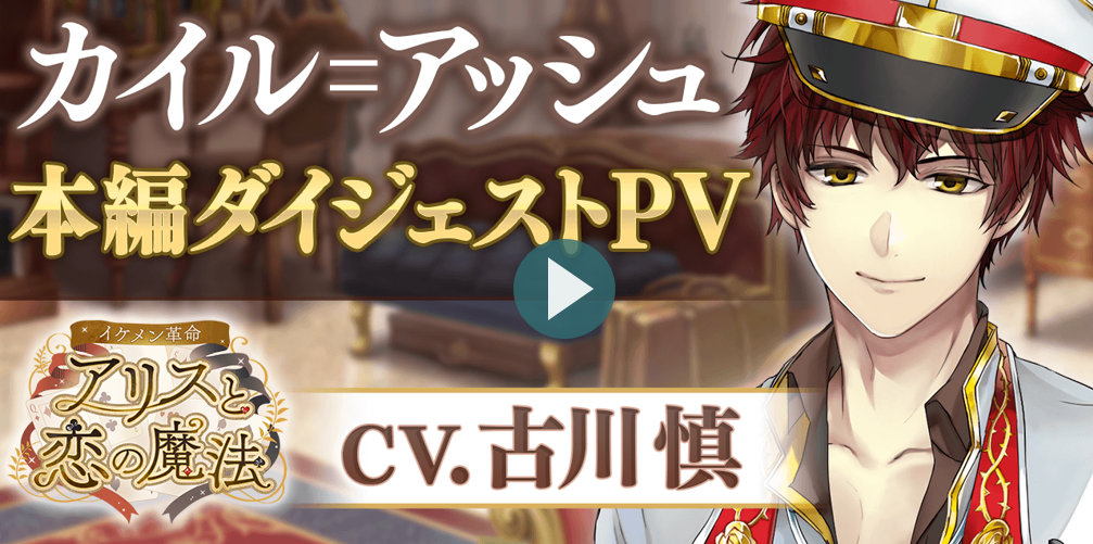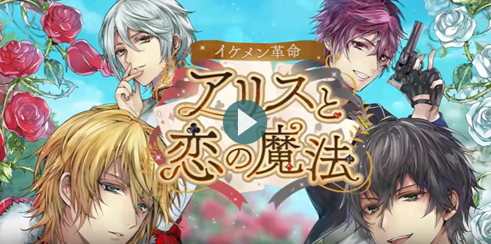 ムービー一覧 2周年記念&新キャラ発表ムービー 【本編PV】ゼロ(CV.熊谷健太郎) 【本編PV】カイル=アッシュ(CV.古川慎) 【本編PV】ルカ=クレメンス(CV.榎木淳弥) 【公式PV】イケメン革命◆アリスと恋の魔法 Fuki Commune 「月が満ちる前に」×イケメン革命 コラボMV キャラクター紹介PV -King- キャラクター紹介PV -Queen- キャラクター紹介PV -Jack- キャラクター紹介PV -Ace- キャラクター紹介PV -赤7×黒10- キャラクター紹介PV -ジョーカー×チェシャ猫- キャラクター紹介PV -白ウサギ×帽子屋-