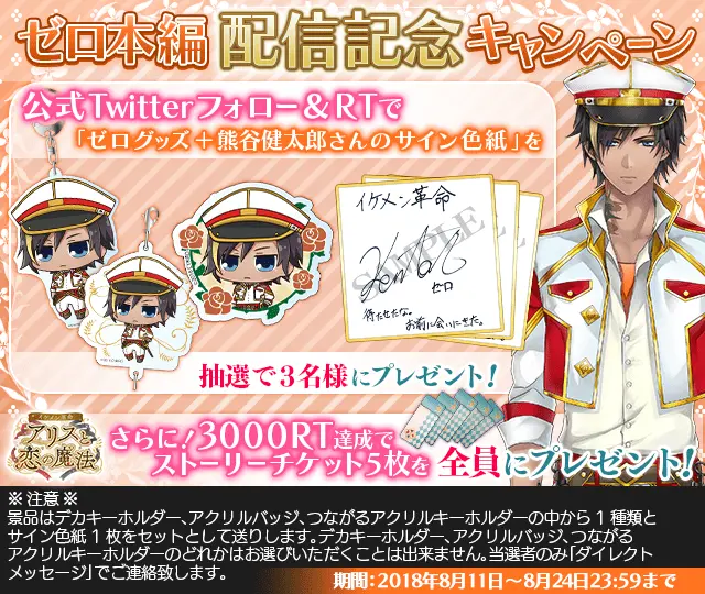 公式Twitter(https://twitter.com/ikemen_revo)をフォローの上、対象ツイートをリツイートいただくと、「ゼロのオリジナルグッズと熊谷健太郎氏のサイン色紙」を、抽選で3名様にプレゼントします。オリジナルグッズは、株式会社コンテンツシードから販売されているデカキーホルダー、アクリルバッジ、つながるアクリルキーホルダーの中からいずれか1種類と、熊谷健太郎氏の直筆サインが入ったサイン色紙をセットにしてお送りします。