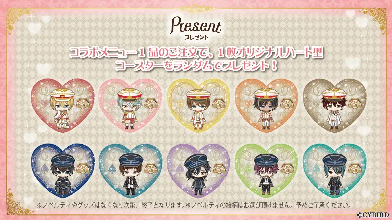 本アプリに登場するイケメンキャラクターたちをイメージしたコラボクレープやドリンクを楽しめるほか、スペシャルコラボメニューを1品オーダーいただく毎に、オリジナルコースターをランダムで1枚プレゼントします。