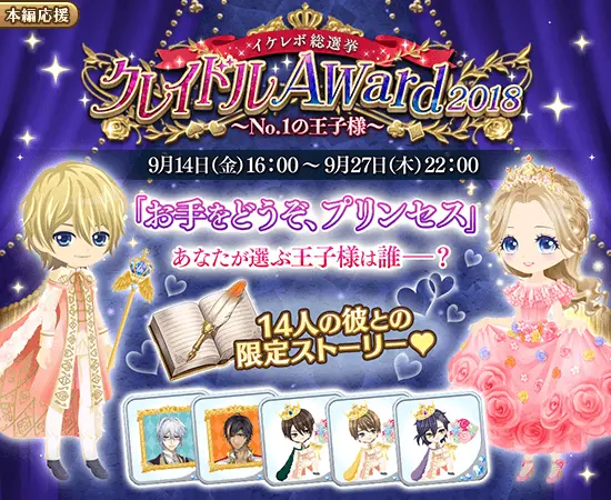 本アプリに登場する不思議の国「クレイドル」のNO.1の王子様を決定する「イケレボ総選挙 クレイドルAward2018~No.1の王子様~」を、2018年9月14日(金)より開催します。投票部門は、「ピュア部門」「セクシー部門」「ジェントル部門」の3つがあり、各部門で1位になったキャラクターは、後日部門名と関連するストーリーを配信します。