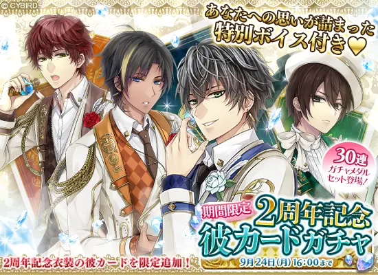 2周年記念衣装に身をまとった「彼カード」が、期間限定で登場します。彼カードとは、マイページに好きなイケメンキャラクターのカードを設定できる機能で、そのカード専用のセリフをお楽しみいただけます。