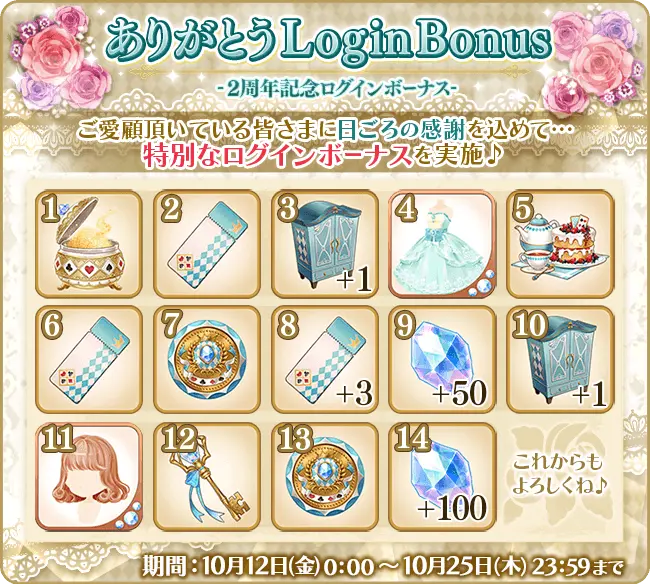 新着情報 2周年ログインボーナス「ありがとうLoginBonus」開催! 2018/10/12 アプリにログインして豪華アイテムをGETしよう♪ さらに2周年当日の10月20日よりアバターデザインコンテストにて受賞したアバターも全員にプレゼント! <ログインボーナス開催期間> 2018年10月12日(金)~10月25日(木) <アバターデザインコンテスト受賞アバタープレゼント期間> 2018年10月20日(土)~10月31日(水) 前の記事 一覧を見る 次の記事