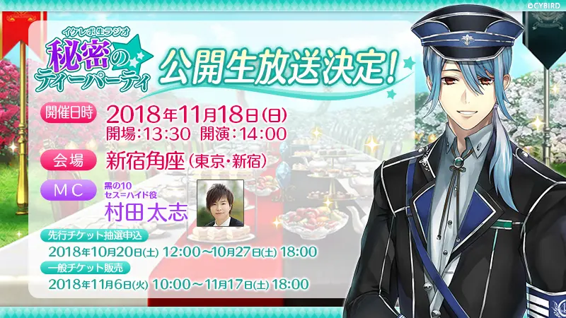サービス開始から2周年を記念し、「イケレボ生ラジオ★秘密のティーパーティ」が初の公開生放送を11月18(日)に”新宿角座”にて開催します。MCの村田 太志氏(セス=ハイド役)をはじめ、熊谷 健太郎氏(ゼロ役)をお迎えして初の映像付きでの放送でお届けします。先行チケットの抽選申し込み受付を、10月20日(土)より開始しました。スペシャルな「レボなま」を、是非お楽しみください。