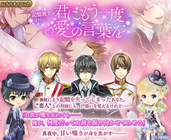 記憶喪失になった主人公(あなた)がもう一度彼との愛を確かめるシナリオイベント「記憶喪失イベント 君にもう一度愛の言葉を」を開催します。本イベントのストーリーは各登場キャラクターの本編にも関連するものになっています。