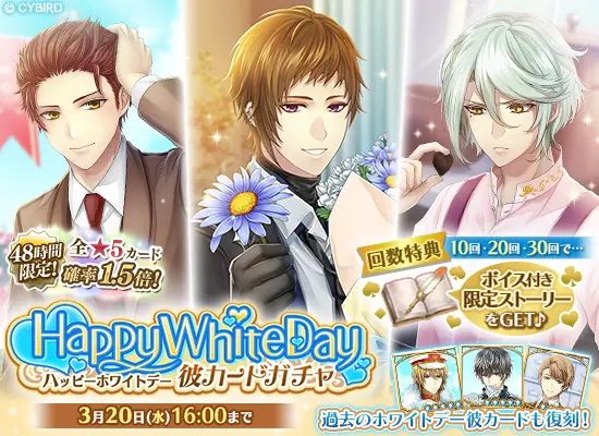 回数特典として10回、20回、30回でボイス付き限定ストーリーをゲットできます。また過去のホワイトデー彼カードも復刻します。