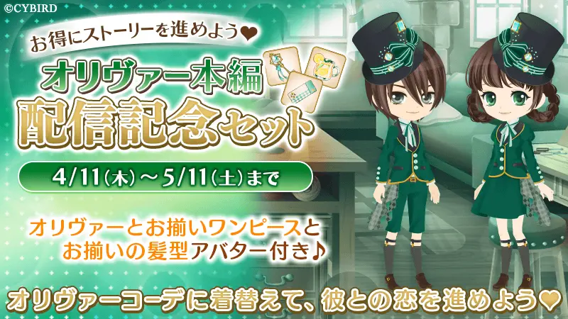 オリヴァー本編ストーリー配信を記念して、オリヴァーとお揃いワンピースやお揃いの髪形アバターが入った「オリヴァー本編配信記念セット」を、4月11日(木)から5月11日(土)まで販売します。
