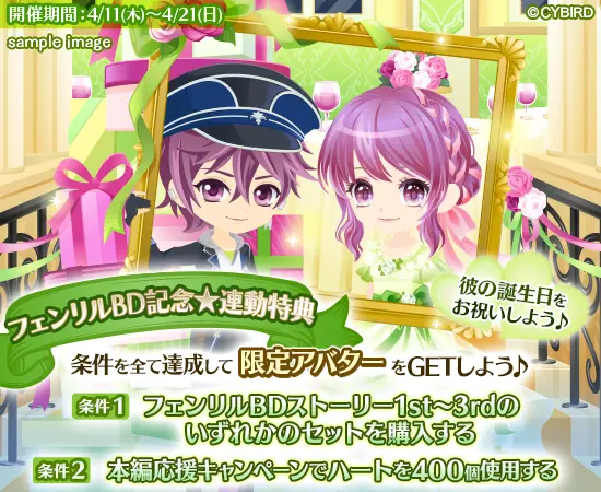 黒の軍のエースであり特攻隊長の、フェンリル=ゴッドスピード (CV: 柿原 徹也)が4月15日に誕生日を迎えるにあたり、こちらのバースデー連動企画を同時開催します。条件を達成すると限定アバターをGETする事ができます。