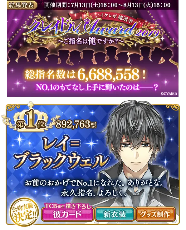 総合優勝に輝いたレイ=ブラックウェル(CV.下野紘)はゲーム内にてTCB先生による描き下ろしのイラストを使用した彼カードがプレゼントされます。また、各順位に輝いた彼たちも、以下の公約実施が決定。