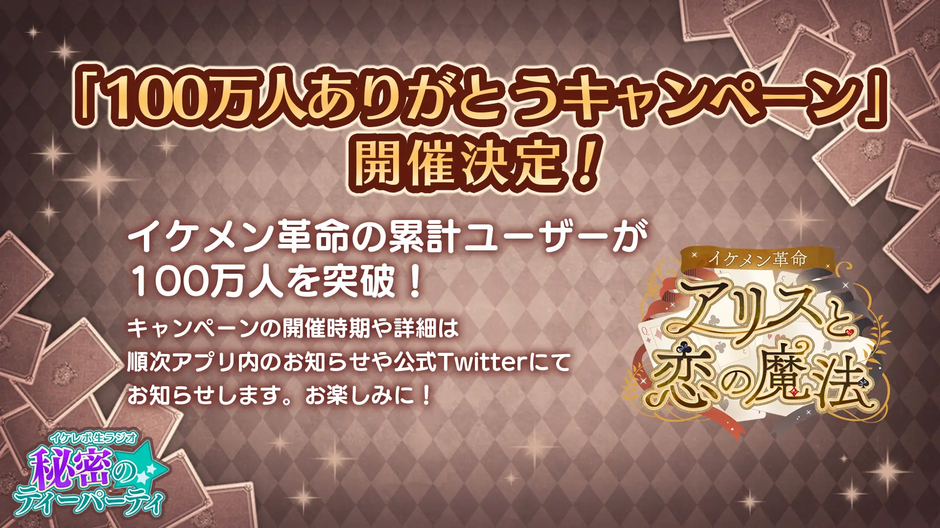 イケメン革命の累計ユーザー数が100万人を突破しました。これを記念して、「100万人記念キャンペーン」を開催いたします。詳細は順次アプリ内お知らせや公式Twitterにてお知らせいたします。